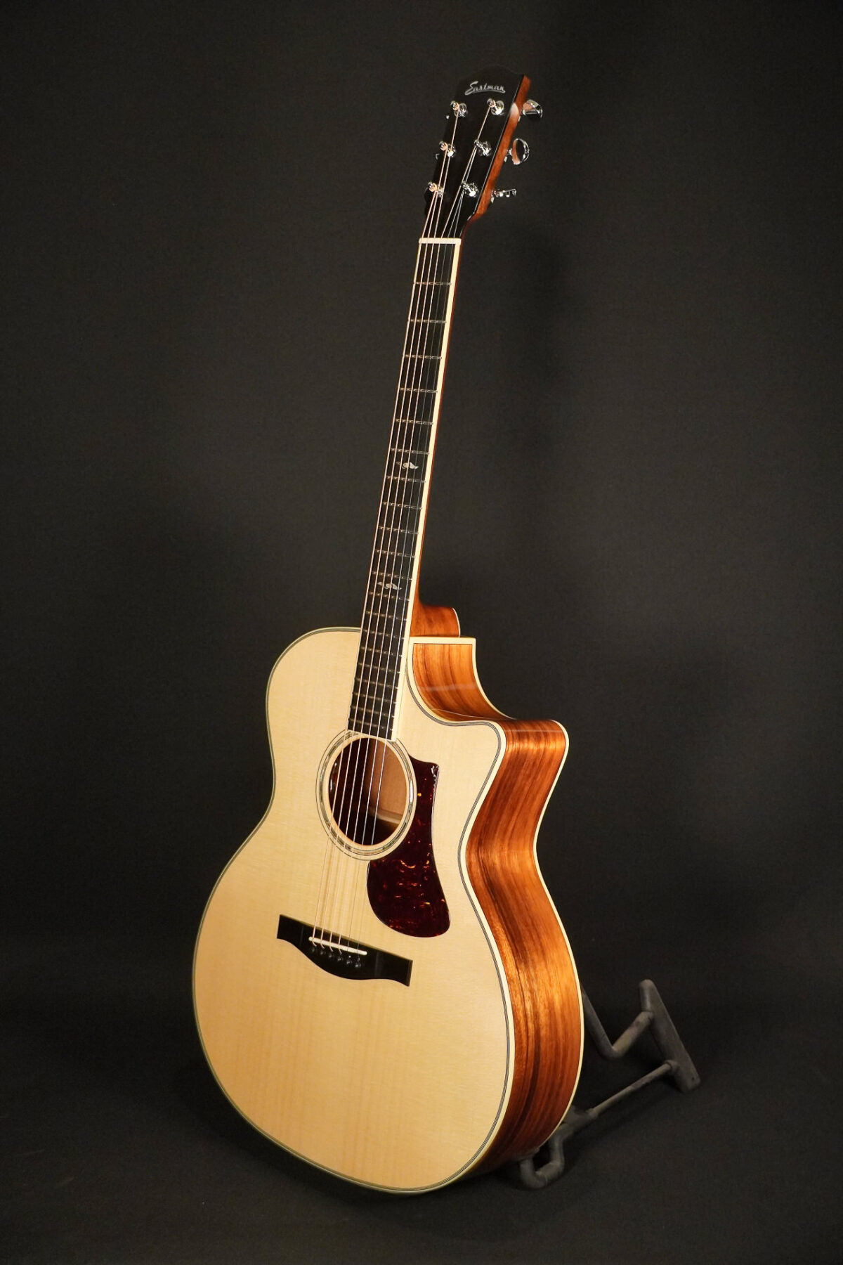Grand Auditorium guitars are rightly regarded as the all-rounders among acoustic guitars. Plenty of mids and basses for chords and strumming, yet fine, clear and ideally suited for fingerstyle. This Grand Auditorium acoustic guitar from Eastman is no exception: a new limited edition model from Eastman with a solid spruce top and body made from solid and beautifully mastered koa. LR Baggs Element EAS VTC pickup already installed, high-quality Eastman case included.