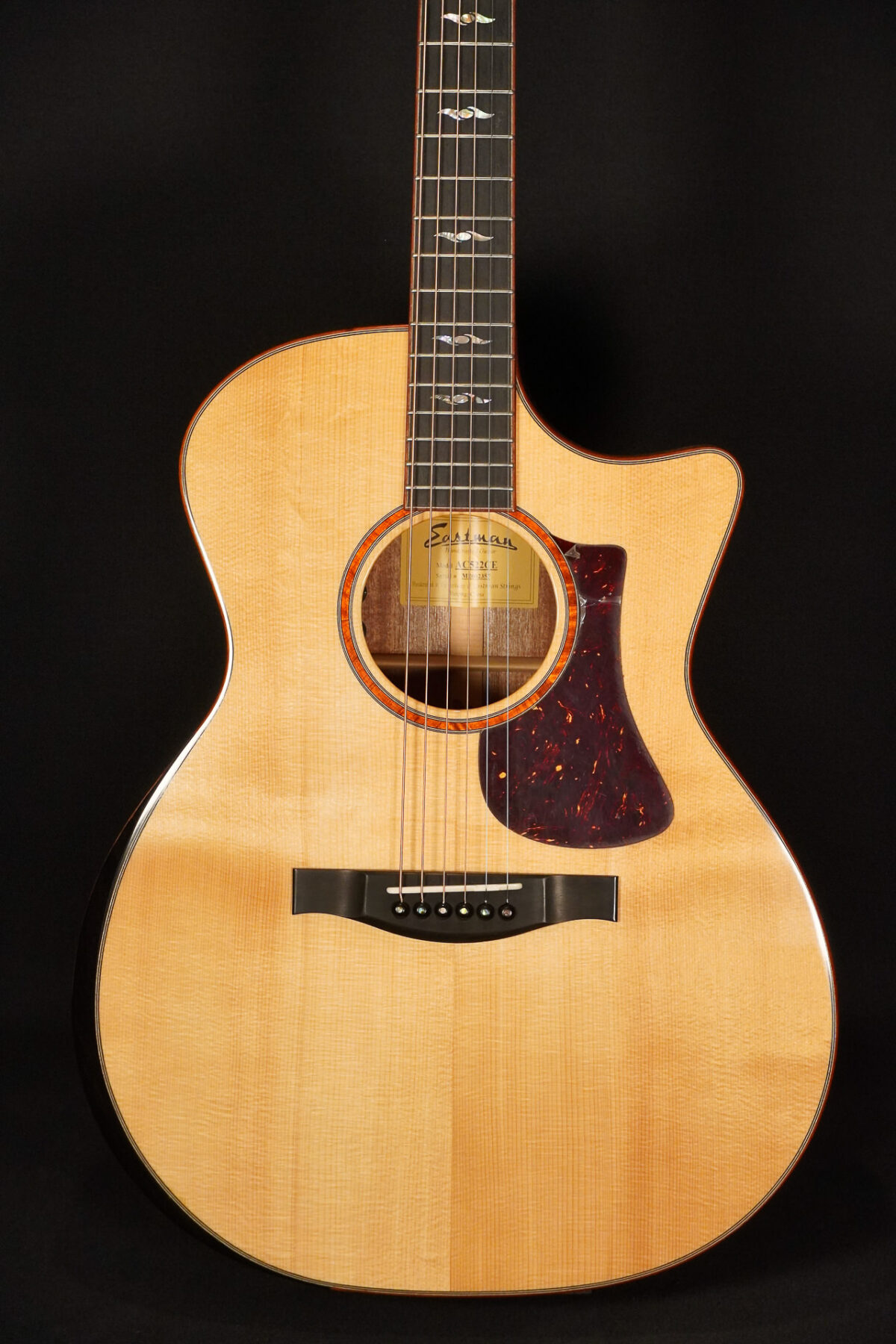 Grand Auditorium guitars are rightly regarded as the all-rounders among acoustic guitars. Plenty of mids and basses for chords and strumming, yet fine, clear and ideally suited for fingerstyle. This Grand Auditorium acoustic guitar from Eastman is no exception. The AC522CE is one of the instruments in Eastman’s all-solid top series: all-solid construction with European spruce Top, African mahogany Body, built-in LR Baggs Element EAS VTC pickup and high-quality Eastman Case included. The built-in armrest makes the guitar even more comfortable to hold than it already is. The AC522CE is also a real eye-catcher visually: Truetone gloss finish, fine bindings and inlays made of mother-of-pearl and high-quality woods.