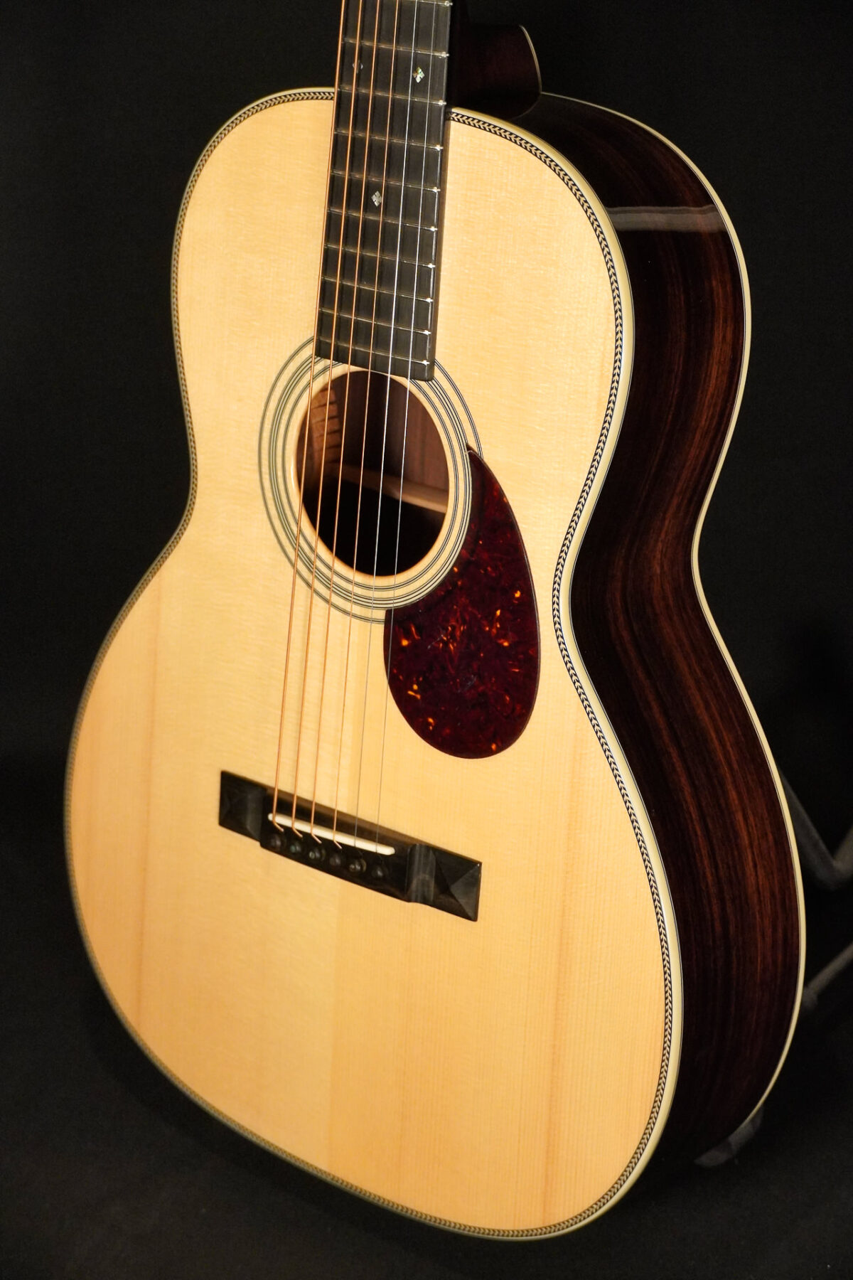Solidly built and very high quality OO acoustic guitar from Eastman in traditional style: solid Adirondack spruce top, Indian rosewood body, window headstock, ebony fingerboard, herringbone binding & mother-of-pearl “snowflake” inlays. This guitar is elegantly inspired by old, well-known models of traditional American guitars, both visually and tonally. An ideal guitar for fingerstyle. High-quality Eastman Case included, of course.