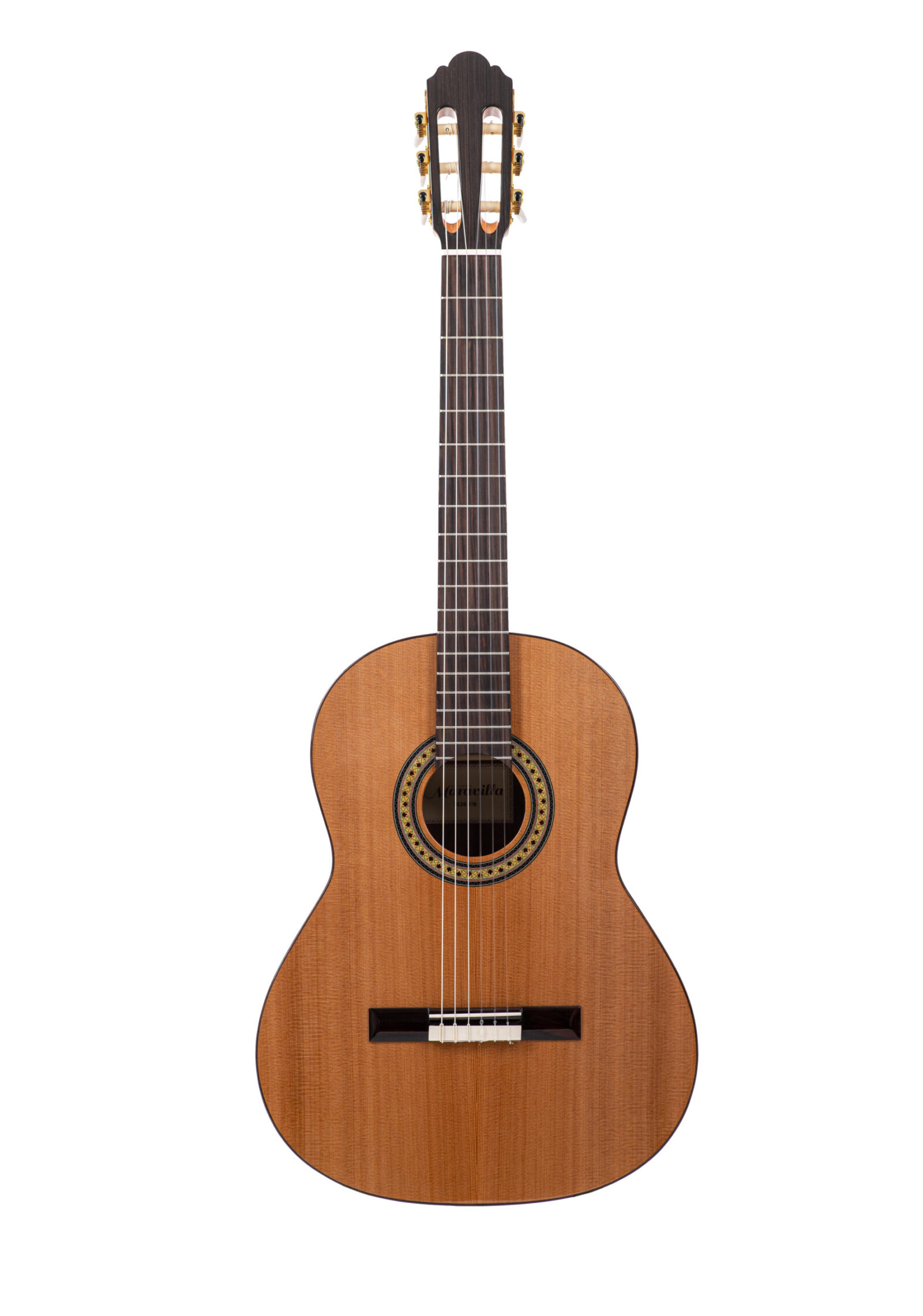 The Maravilla M20 7/8 is the so-called “Señorita model” within our M20 line of Spanish study guitars. This instrument was specially developed for serious students with smaller hands and has a scale length of 630 mm and a neck width of 50 mm at the nut. A beautiful piece of Western Red Cedar was selected for the Top. The body is made of laminated Sapele.