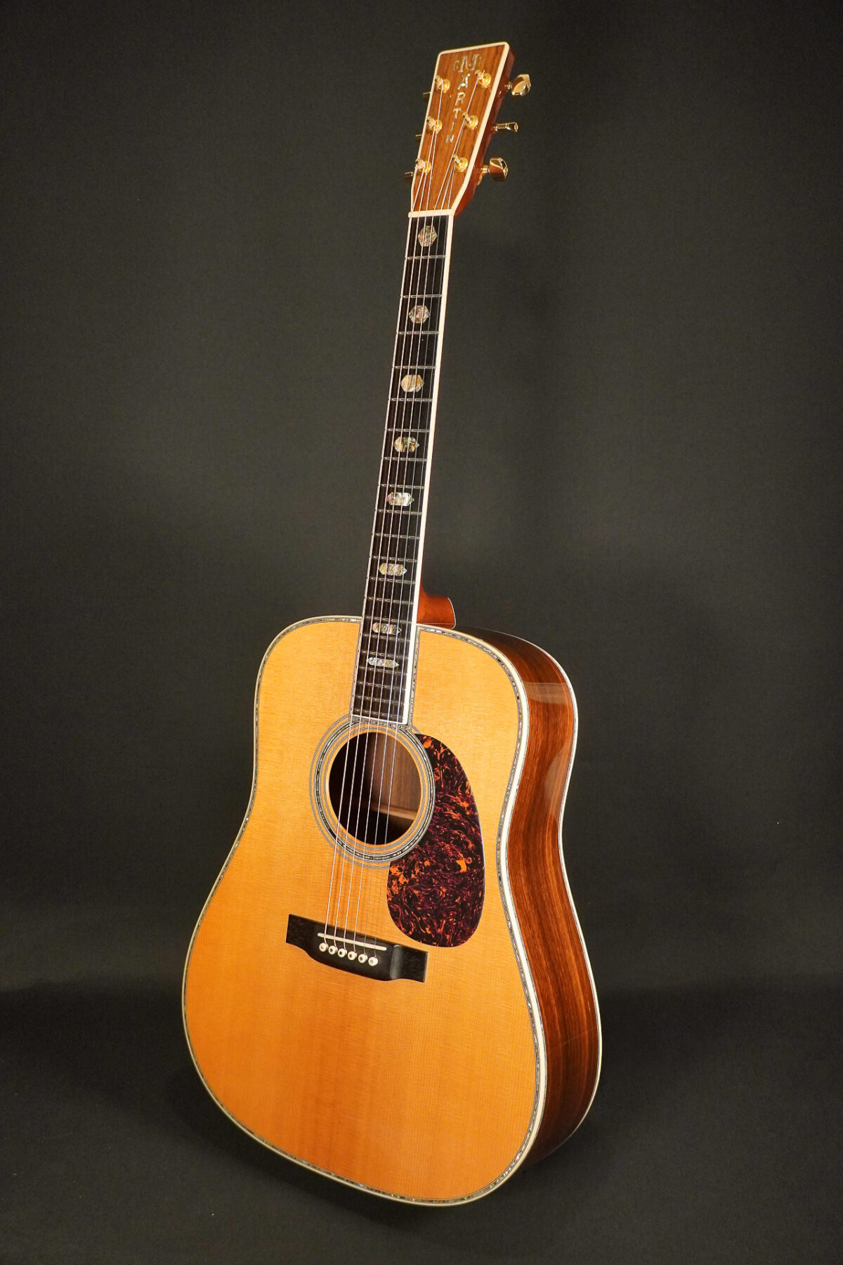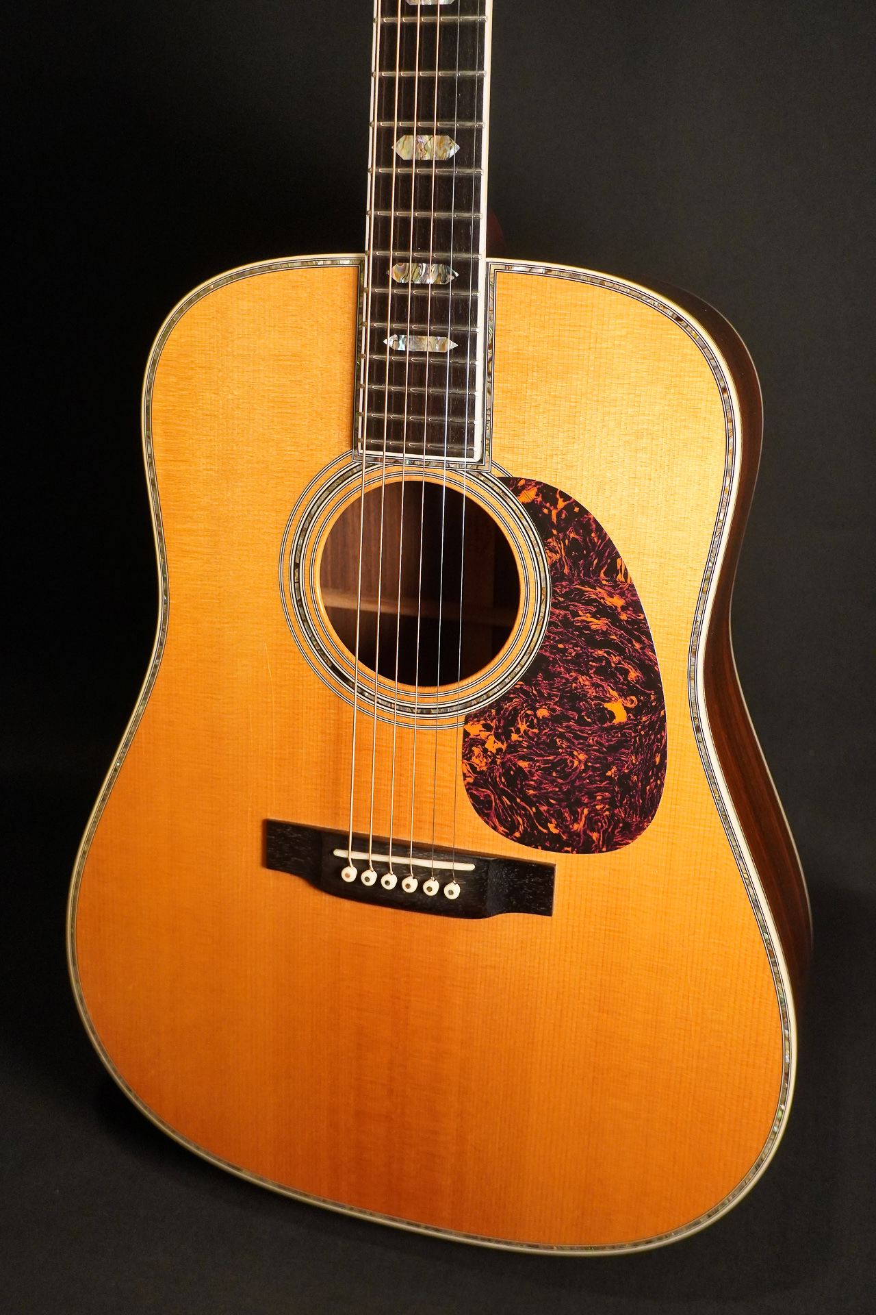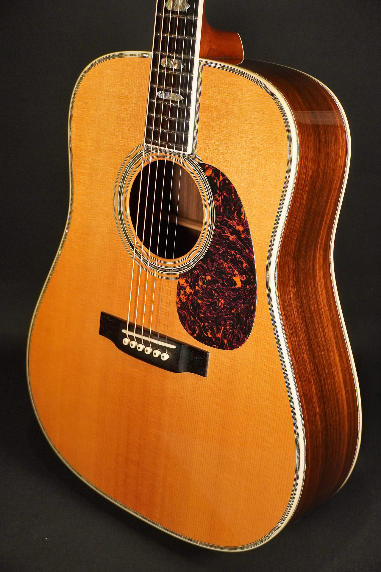 These are the typical visual characteristics of a Martin D-45: Top made of Sitka spruce, sides & back made of rosewood (Brazilian Rosewood or Indian Rosewood depending on the year of manufacture and series), fingerboard made of ebony and inlays made of abalone as far as the eye can see. There were also 12-fret models built, but in most cases a D-45 is a 14-fret dreadnought.