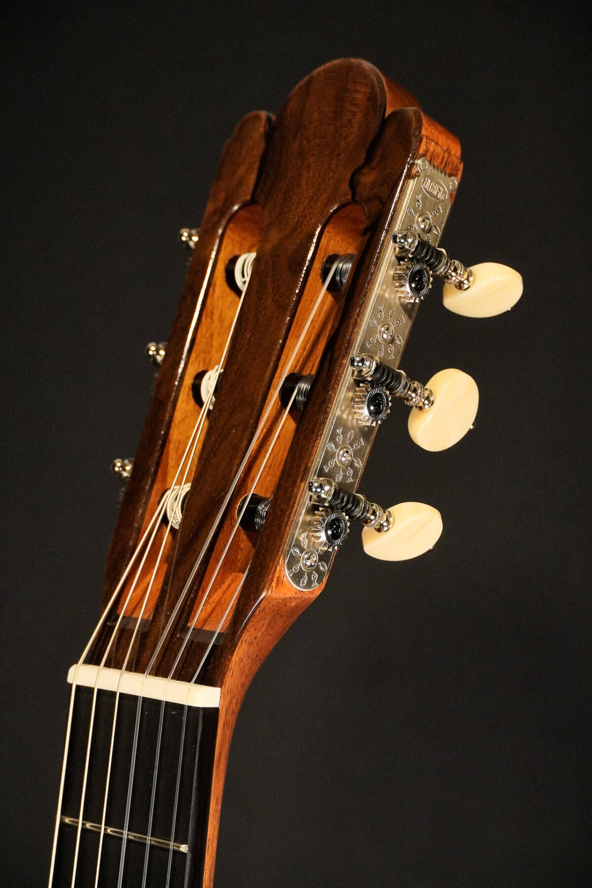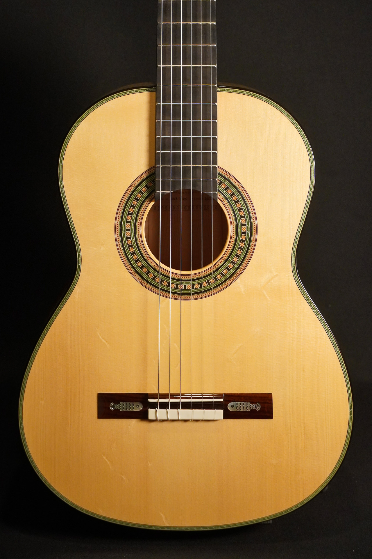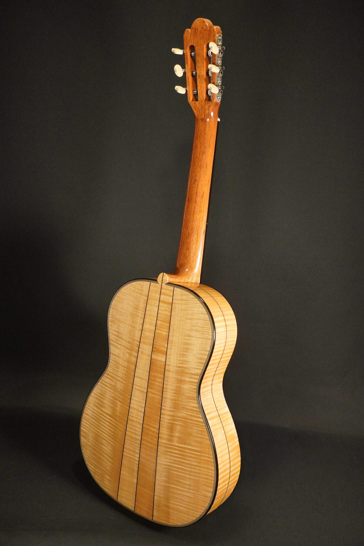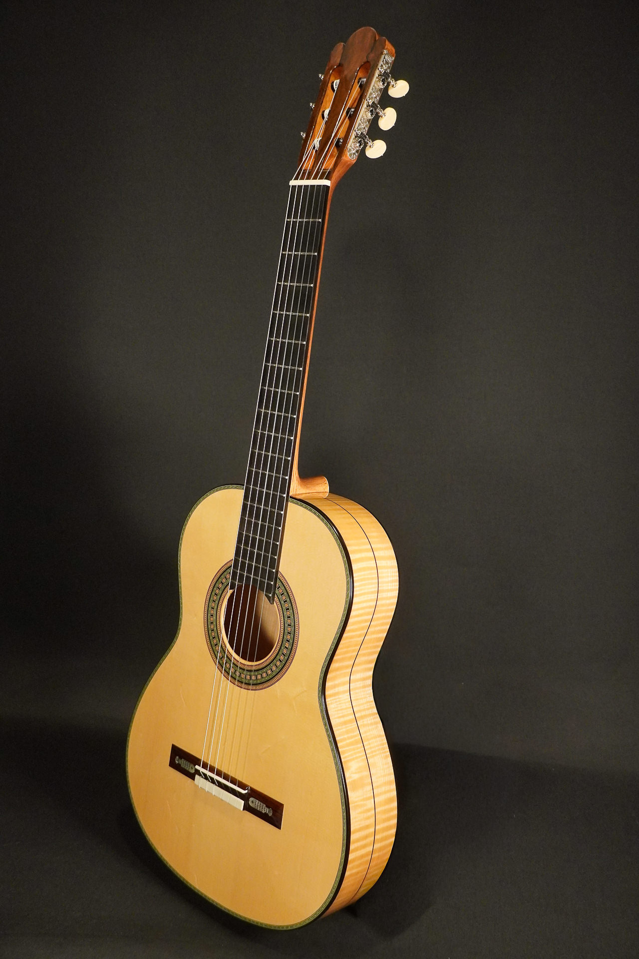 This beautiful instrument from Jellinghaus is based on a guitar built by the world-famous Spanish luthier Antonio de Torres in 1883. The priceless original still exists today and was carefully examined to build this Jellinghaus guitar. The solid Alpine spruce Top is combined with solid, beautifully grained maple. Fine and beautifully crafted inlays of wood and mother-of-pearl, as well as the shellac finish make this guitar a feast for the eyes. In terms of sound, this very lightly built guitar can be described as wonderfully clear, resonant and with a very fast response. A great instrument.