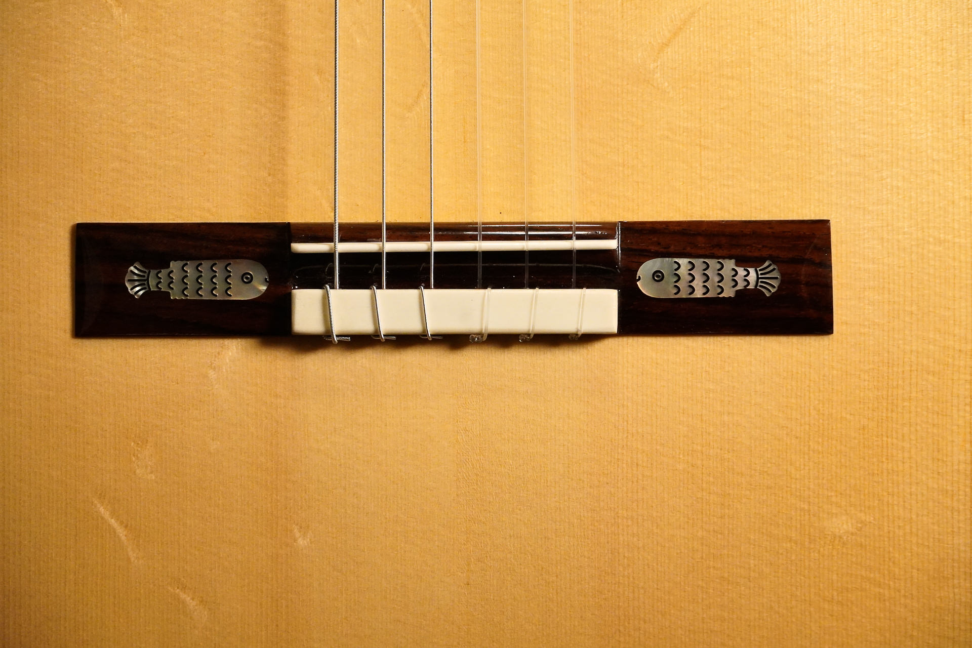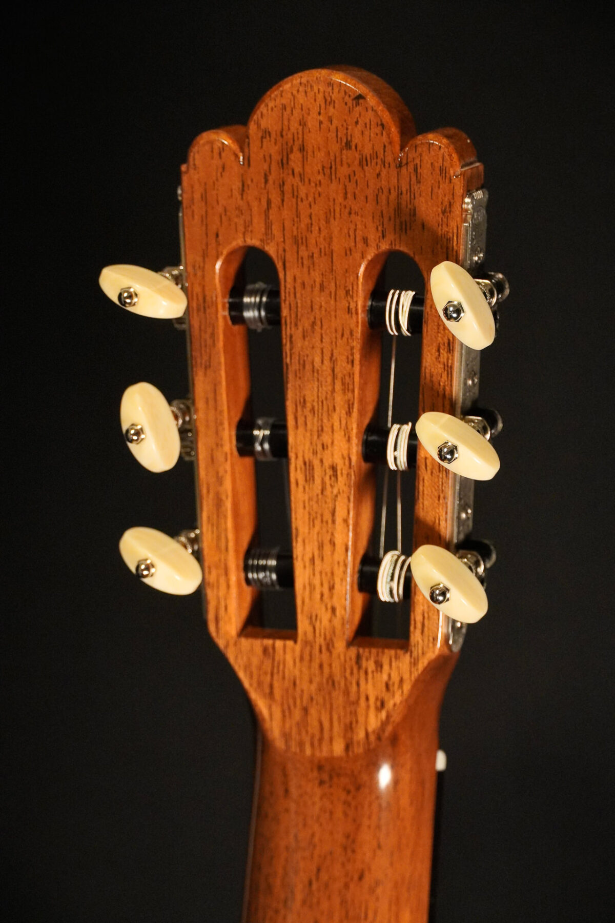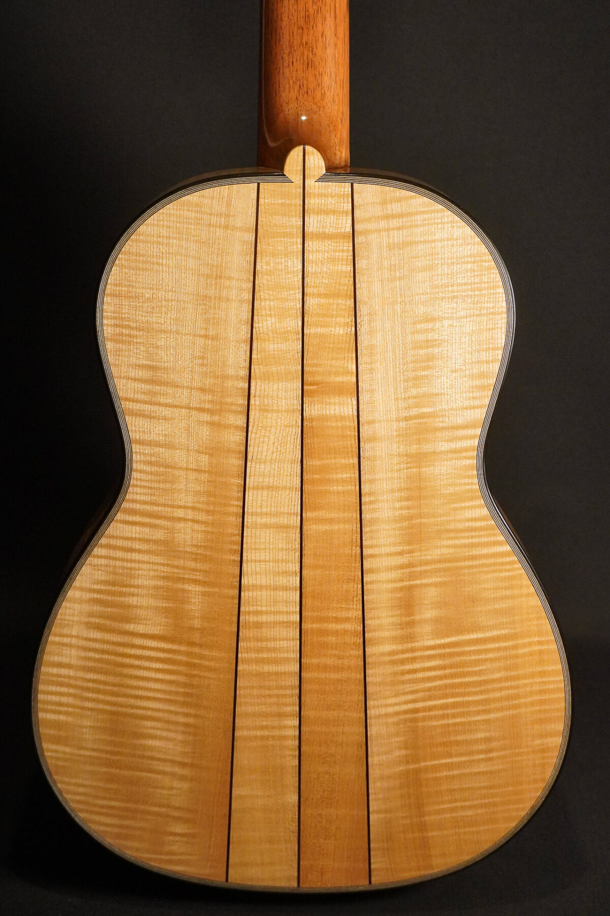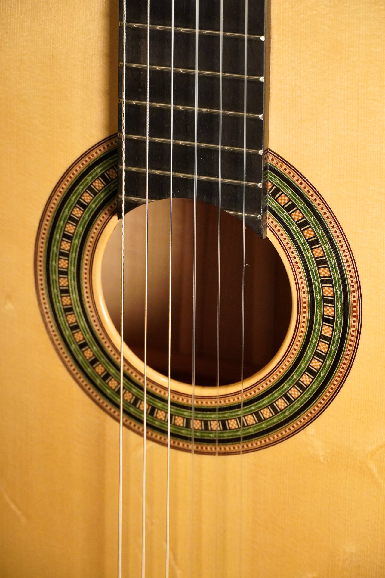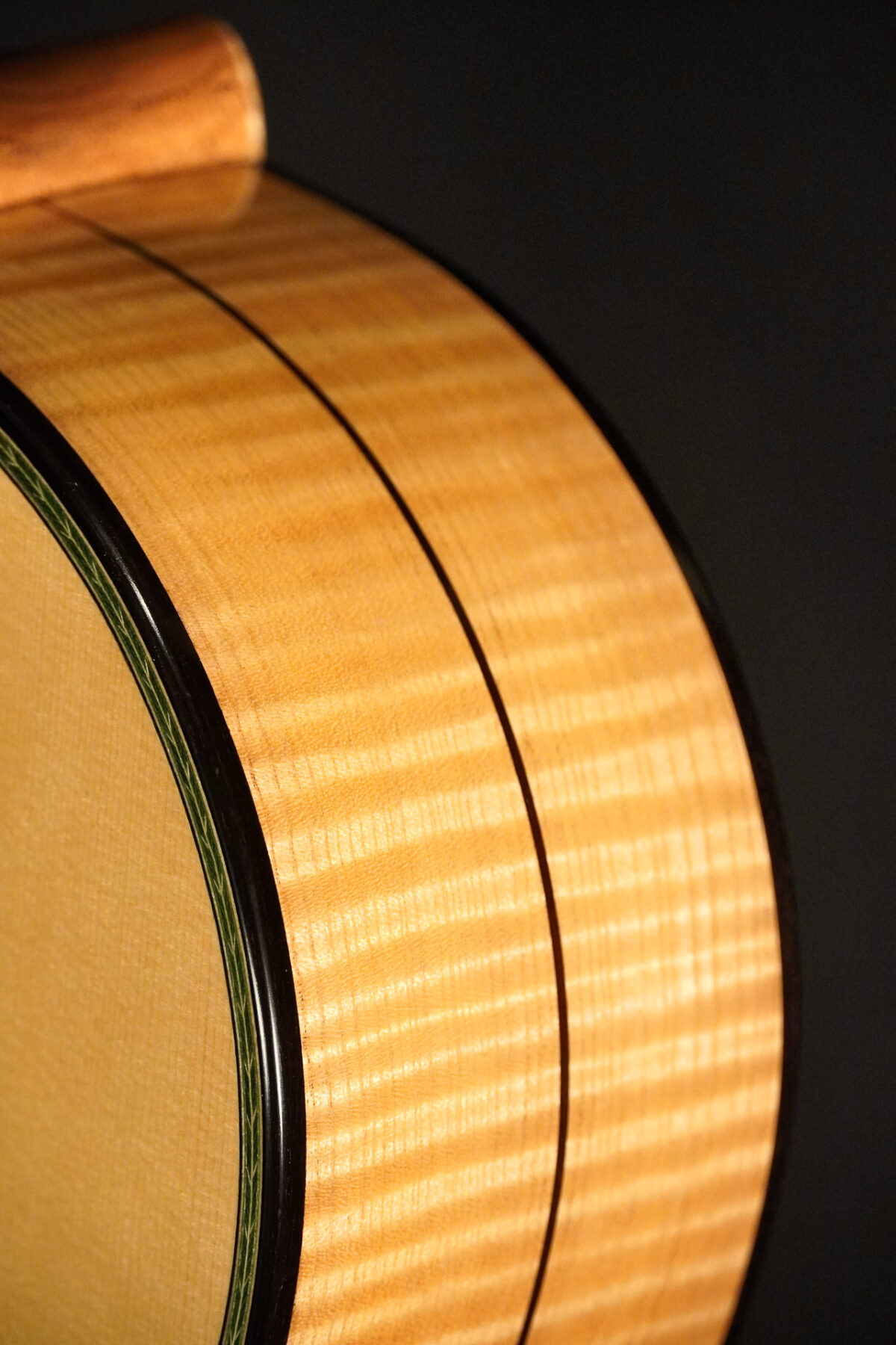 This beautiful instrument from Jellinghaus is based on a guitar built by the world-famous Spanish luthier Antonio de Torres in 1883. The priceless original still exists today and was carefully examined to build this Jellinghaus guitar. The solid Alpine spruce Top is combined with solid, beautifully grained maple. Fine and beautifully crafted inlays of wood and mother-of-pearl, as well as the shellac finish make this guitar a feast for the eyes. In terms of sound, this very lightly built guitar can be described as wonderfully clear, resonant and with a very fast response. A great instrument.