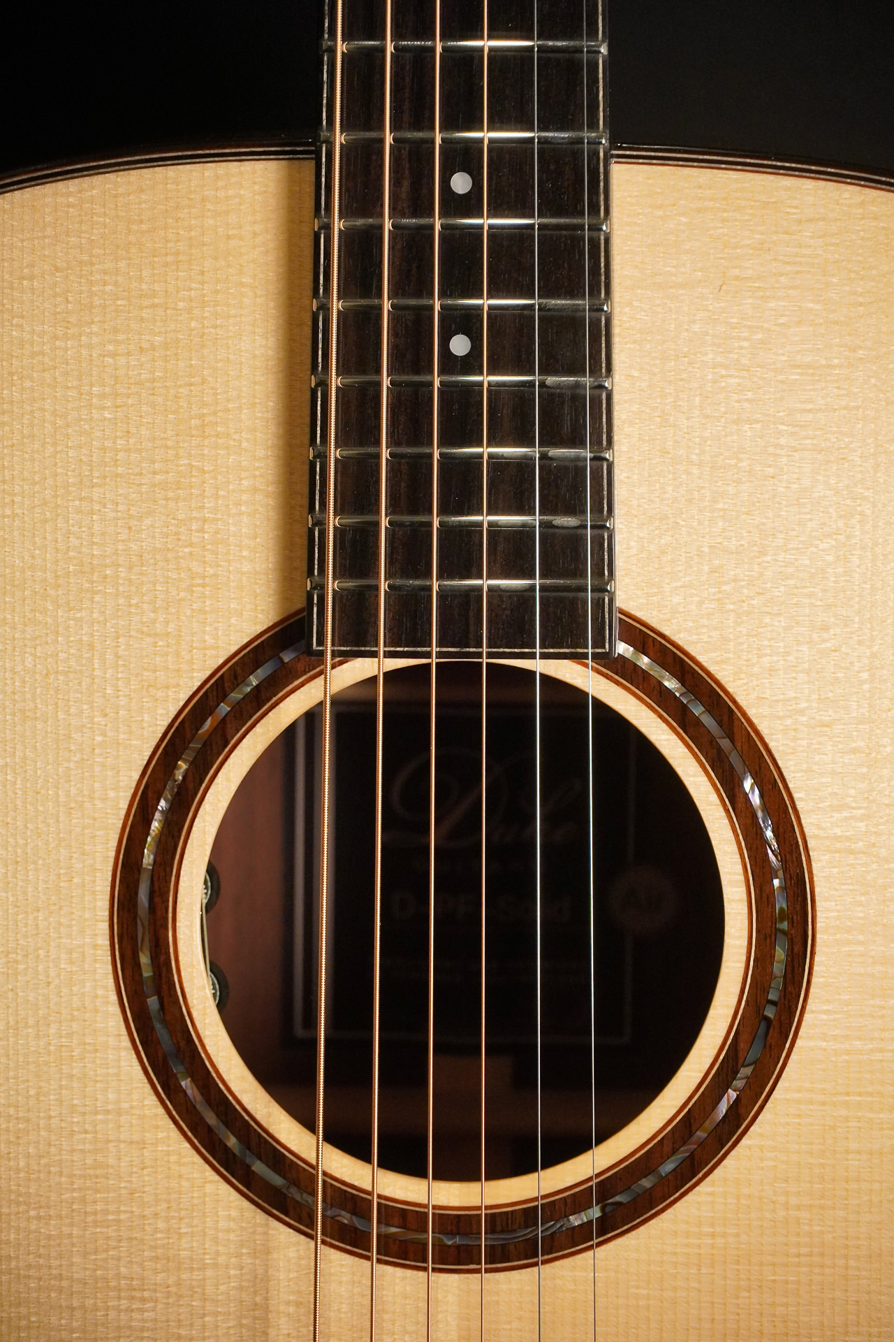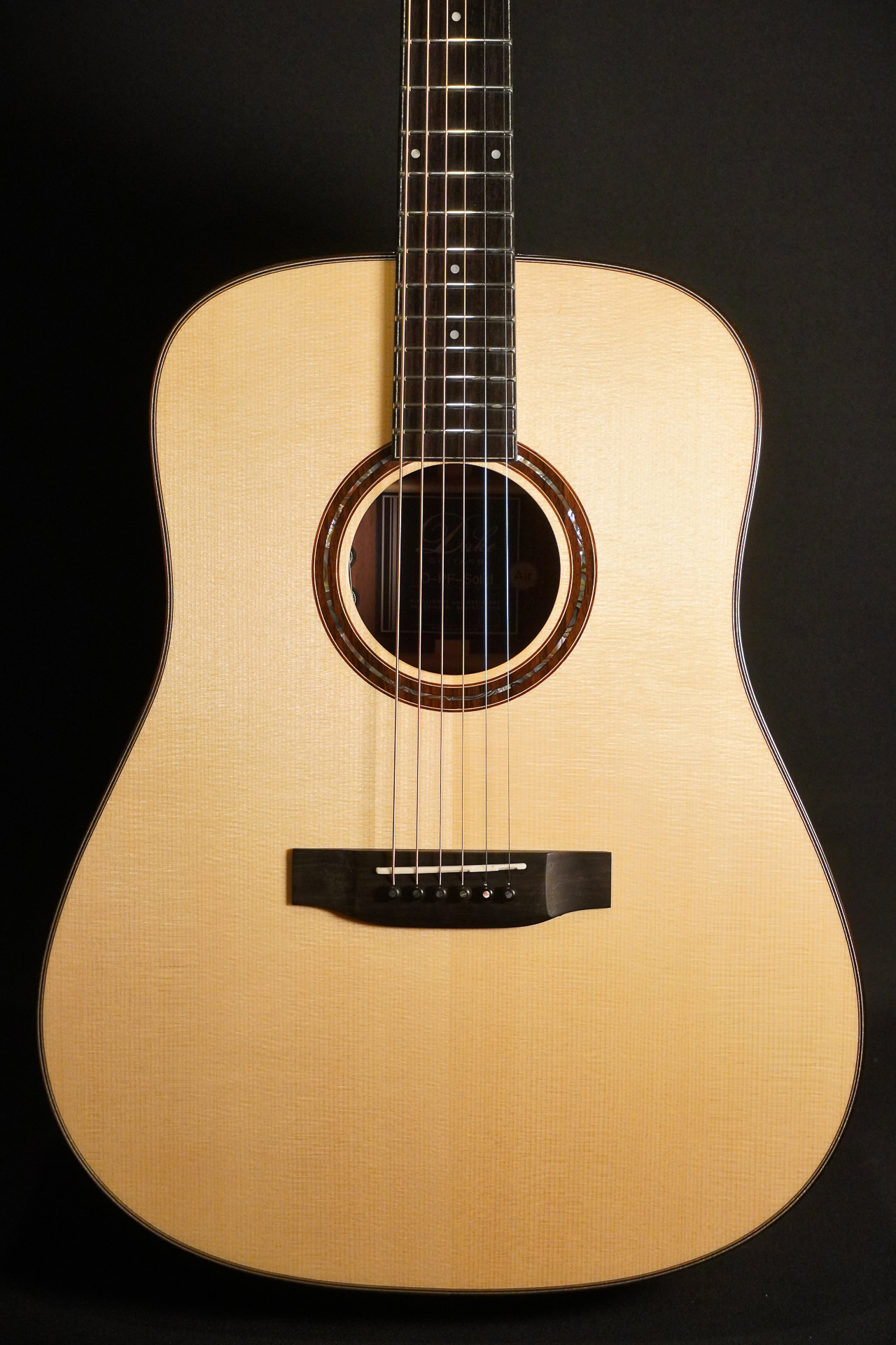 Dreadnought Model von Duke mit massiver Fichtendecke, massivem Boden & Zargen aus feinem indischen Palisander. Hochglanzlackierung, eingebauter Misi trio Air Tonabnehmer. Klanglich wunderbar kraftvoll und brilliant.
