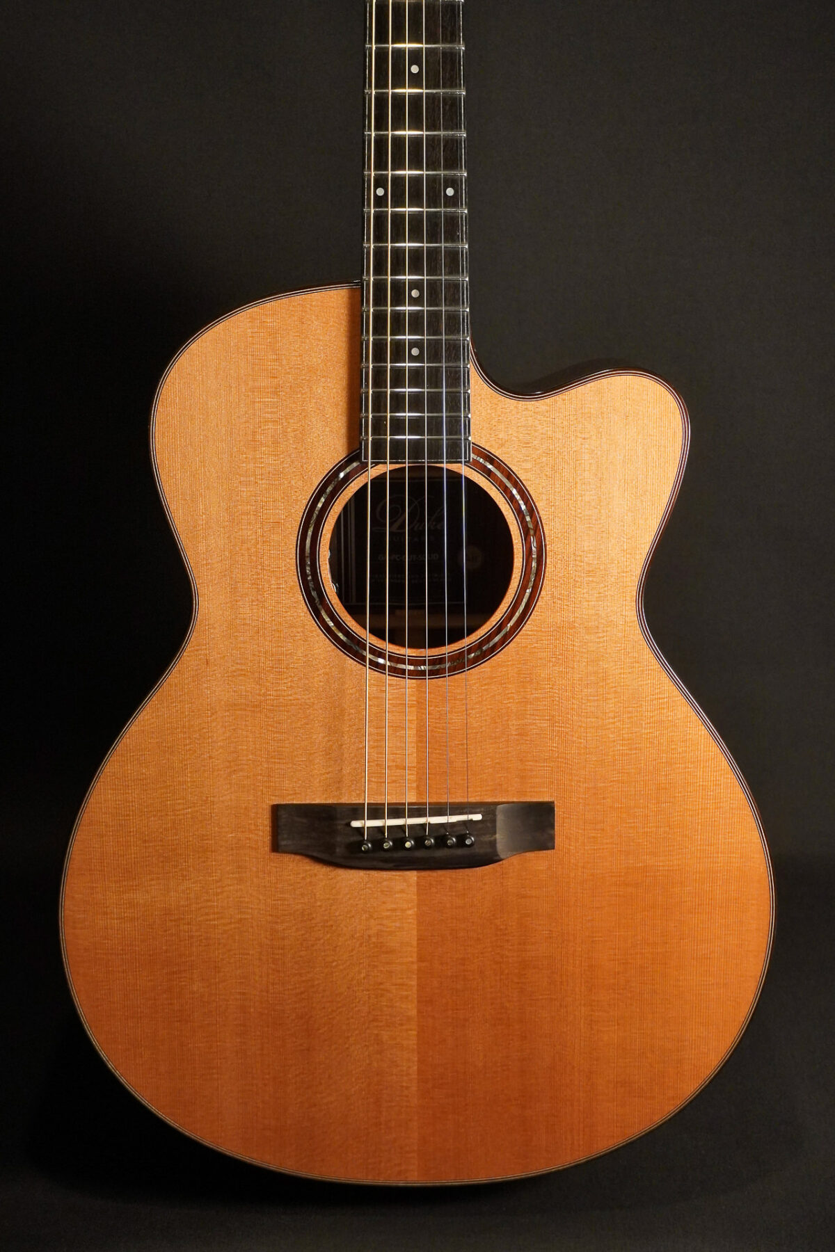 Grand Auditorium Modell aus dem Hause Duke mit massiver Zederndecke und Korpus aus schönem massivem indischen Palisander. Im Vergleich zur GA-PF ist die GA-PC von Duke Guitars etwas wärmer im Klang. Diese Gitarre ist ausserdem mit Cutaway gebaut und ab Werk mit dem Misi Trio Air Tonabnehmer ausgestattet. Der Misi verstärt batteriefrei und leicht den natürlichen Klang dieser tollen vollmassiv gebauten Duke.