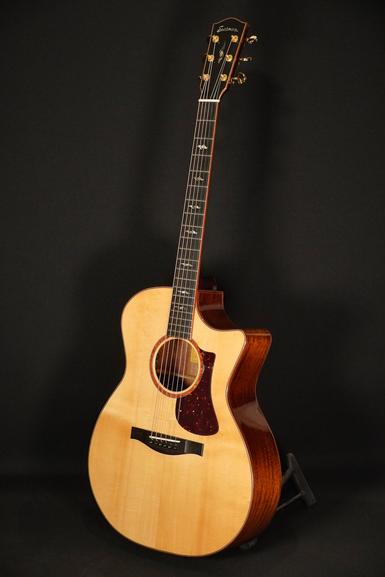 Grand Auditorium Gitarren gelten zu Recht als die Allrounder unter den Westerngitarren. Reichlich Mitten und Bässe für Akkorde und „Strumming“, zugleich fein, klar und für „Fingerstyle“ bestens geeignet. So auch diese Grand Auditorium Westerngitarre von Eastman. Die AC522CE gehört zu den Instrumenten der vollmassiven Topserien von Eastman: Vollmassiv gebaut mit Decke aus europäsischer Fichte, Korpus aus afrikanischem Mahagoni, eingebauter LR Baggs Element EAS VTC Tonabnehmer und hochwertiger Eastman Koffer inklusive. Durch die verbaute Armschräge liegt die Gitarre noch angenehmer als ohnehin schon in der Hand. Auch optisch ist die AC522CE ein echter Blickfang: Truetone Gloss Finish, feine Bindings und Einlegearbeiten aus Perlmutt und hochwertigen Hölzern.