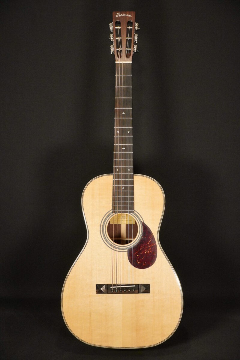 Vollmassiv gebaute und sehr hochwertige Parlor Westerngitarre von Eastman im traditionellen Stil: Massive Adirondack Fichtendecke, Korpus aus indischem Palisander, Ebenholzgriffbrett, Herringbone Binding & „Snowflake“ Inlays aus Perlmutt. Diese Gitarre orientiert sich auf elegante Weise an alten bekannten Vorbildern traditioneller amerikanischer Gitarren, optisch wie klanglich. Eine ideale Gitarre für Fingerstyle. Hochwertiger Eastman Koffer natürlich inklusive.