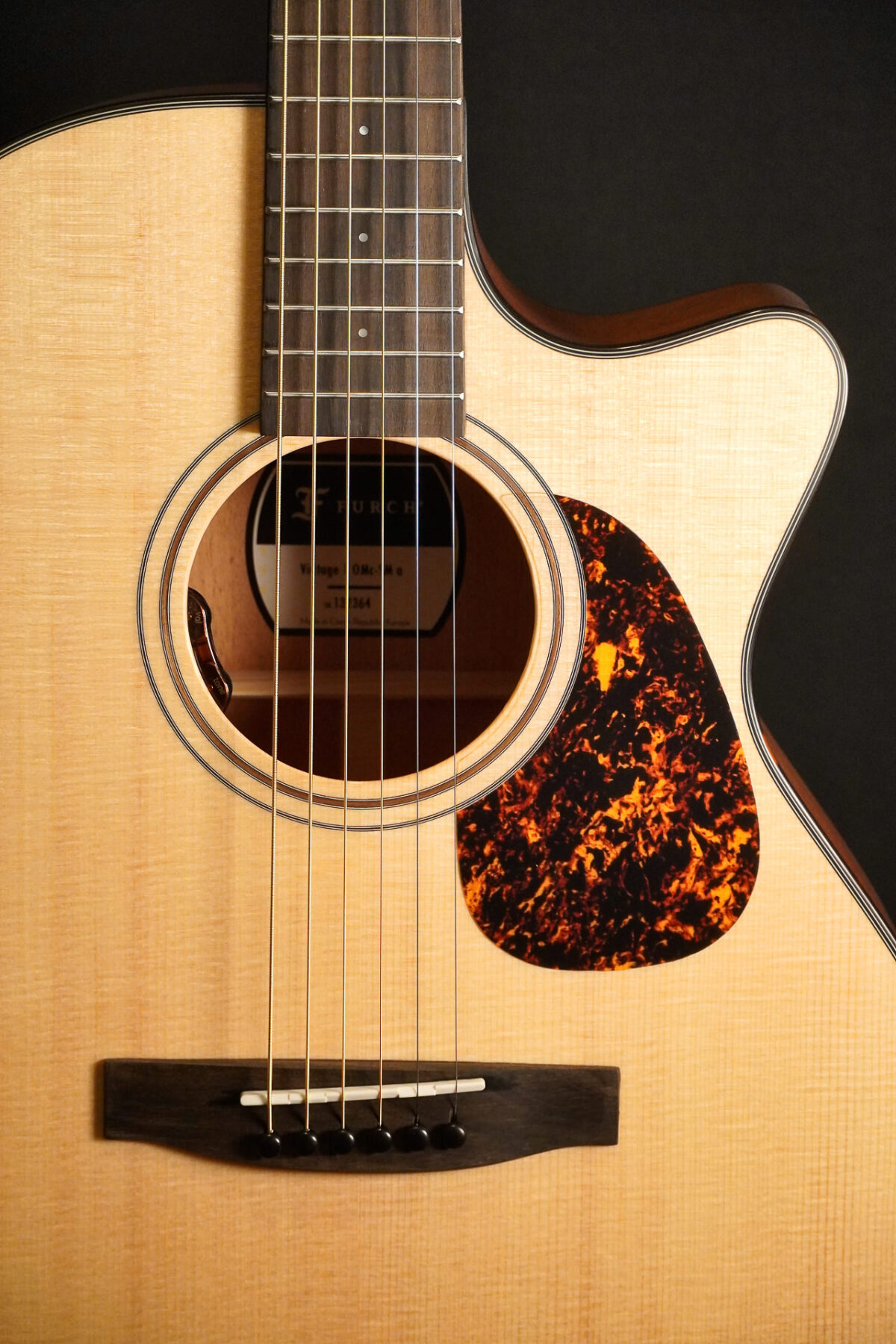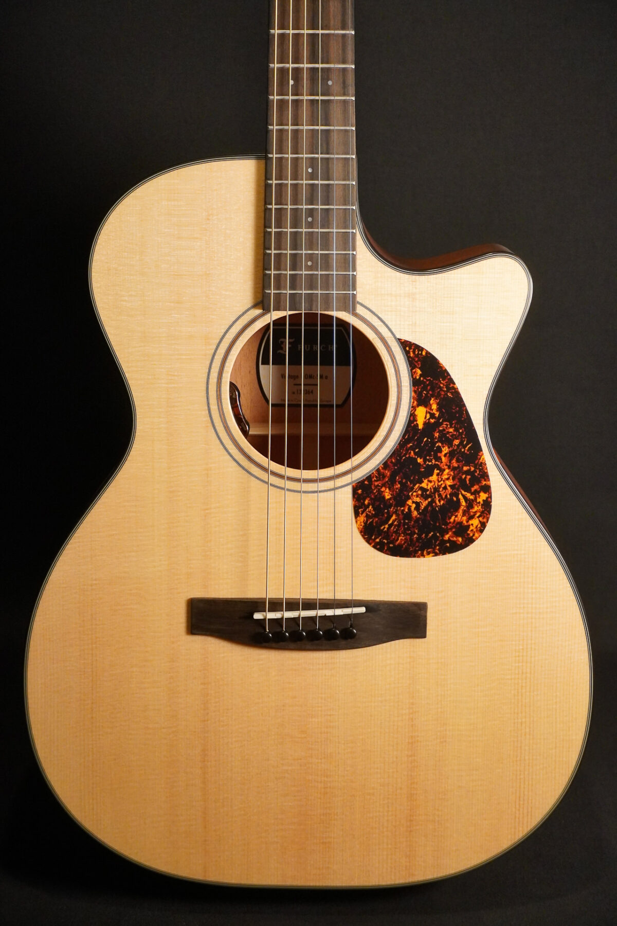 Tolle OM aus der Vintage Serie von Furch mit massiver Decke aus Sitkafichte, Boden und Zargen aus Mahagoni.