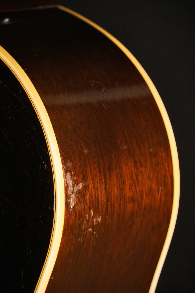 Die Gitarre hat irgendwann in ihrem Leben einen Neckreset erhalten und Risse in der Decke wurden repariert. Die Gitarre wird mit einem Hartschalenkoffer geliefert; der Originalkoffer ist nichtmehr vorhanden. Die Gitarre spielt sich hervorragend und klingt genau so, wie es sich für eine alte Gibson gehört. Sie wurde außerdem von unseren Gitarrenbauern professionell eingestellt. Die notwendigen CITES Dokumente für Riopalisander sind natürlich vohanden & inklusive.