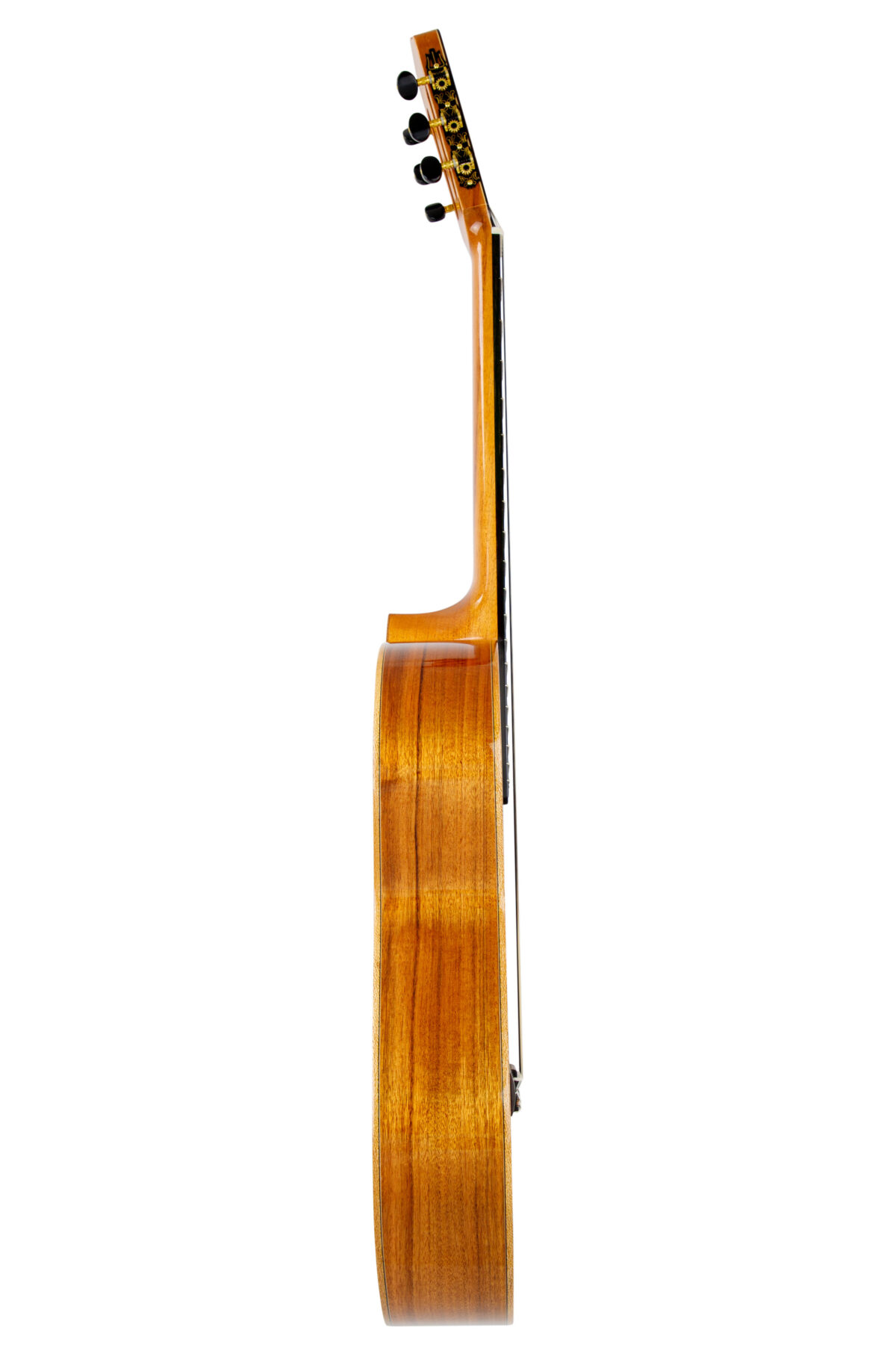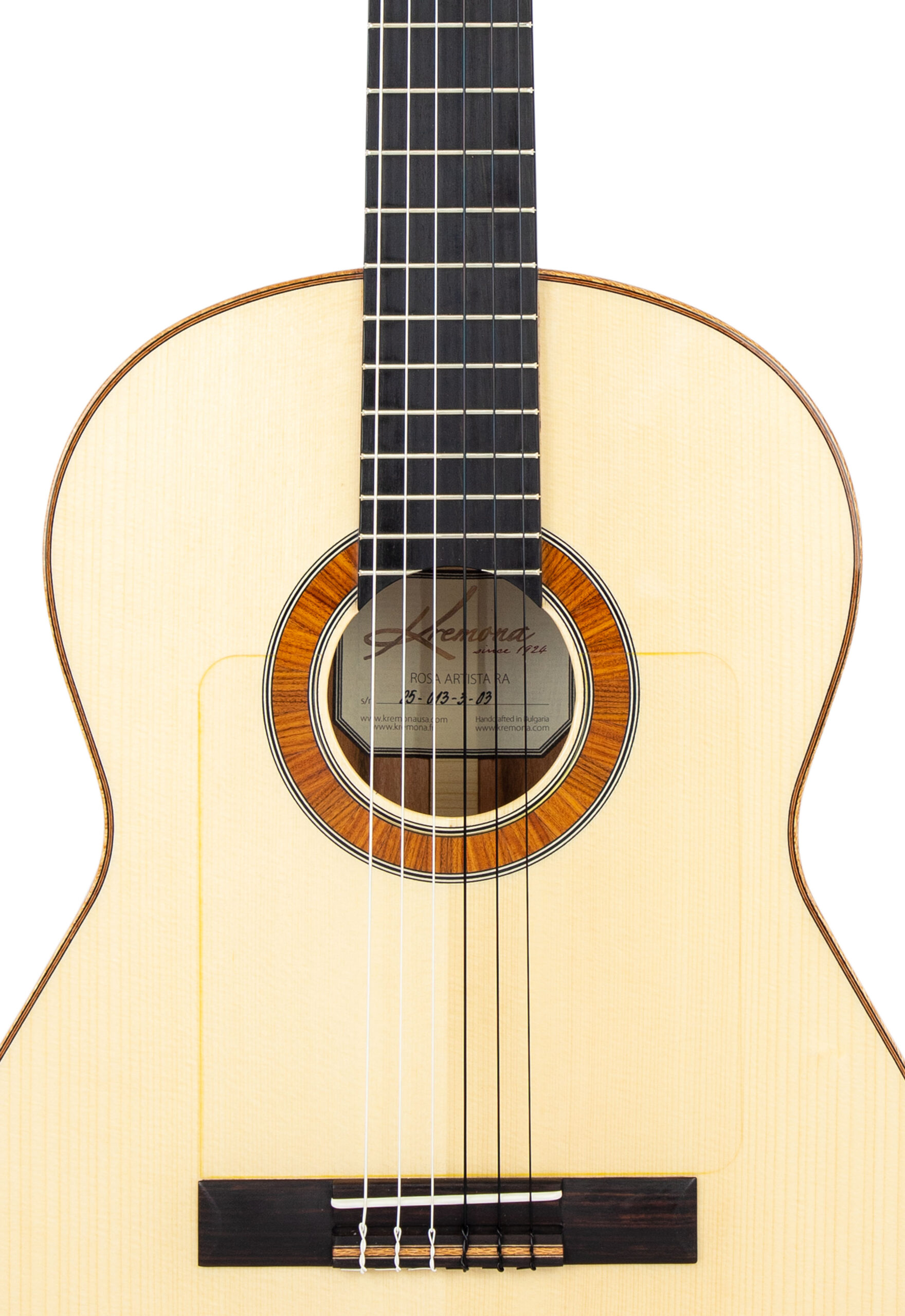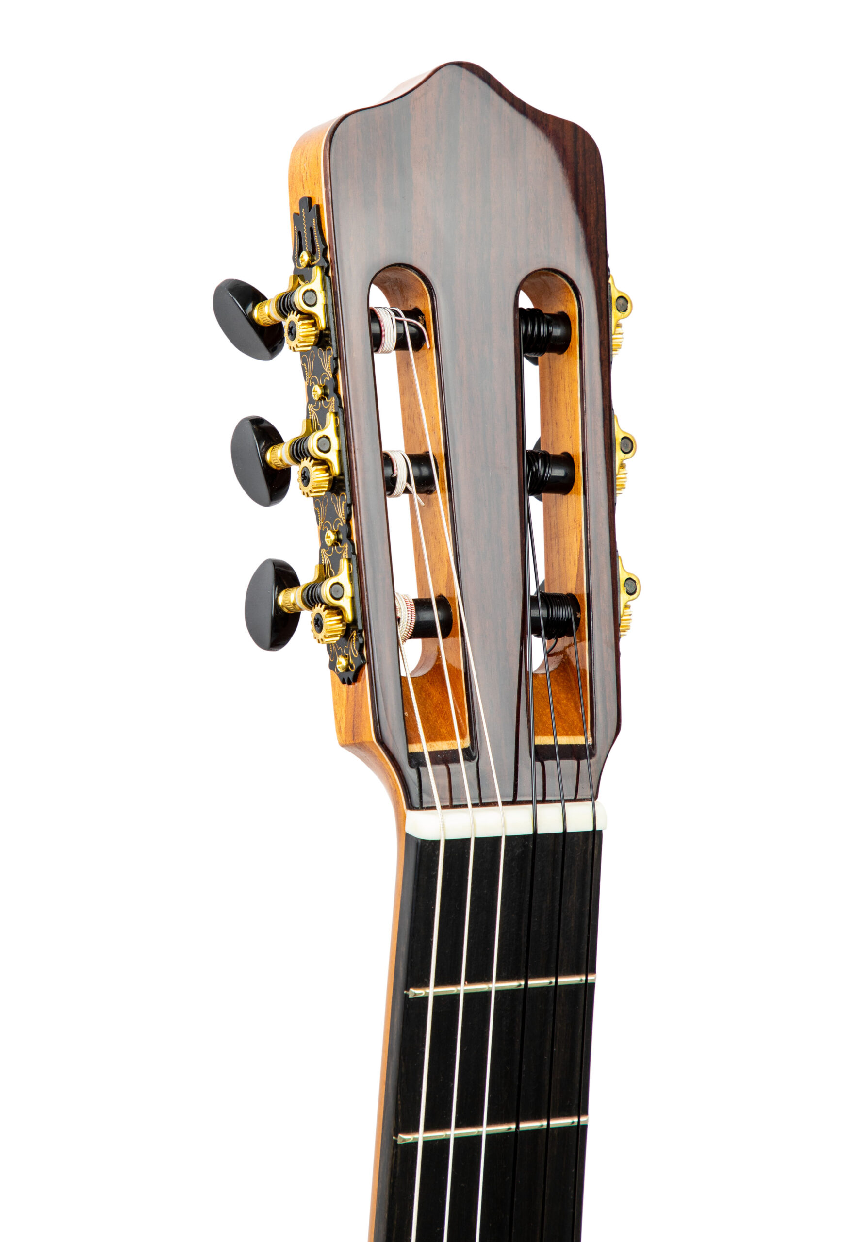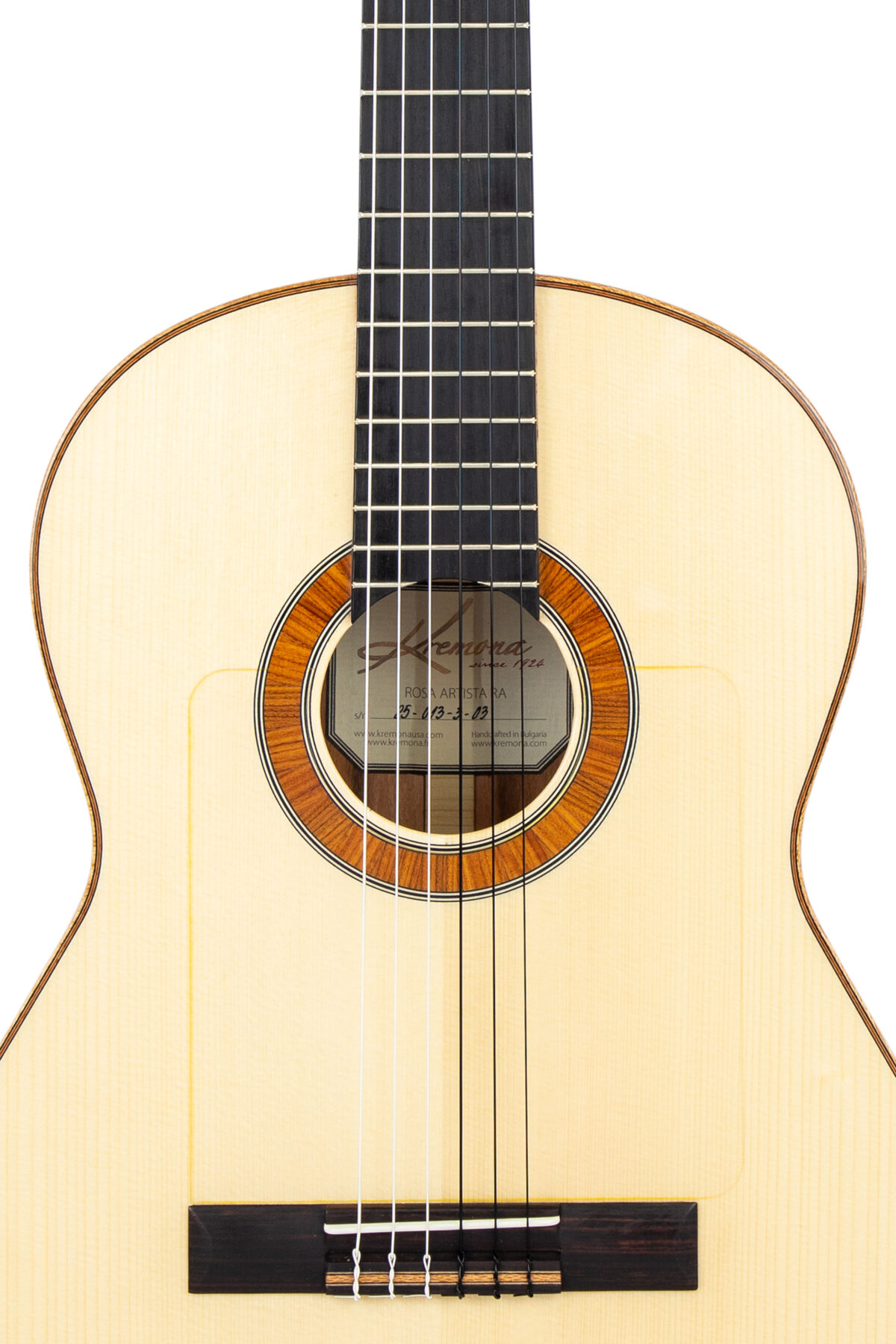 Die Rosa Artista ist sinnlich, dynamisch und für jedes Konzert oder Studio geeignet. Sie bietet den kraftvollen Anschlag, den Flamenco-Spieler lieben, und eine zusätzliche Tiefe durch die Kombination von massiver europäischer Fichte und massivem patagonischem Palisander. Sie verfügt über einen traditionellen 52 mm breiten Hals und eine 650 mm Mensur, ein transparentes Schlagbrett und eine handgelegte Holzrosette. Weitere Merkmale sind ein Griffbrett und Steg aus Ebenholz, Sattel und Stegeinlage aus Knochen sowie goldene Mechaniken mit schwarzen Knöpfen.