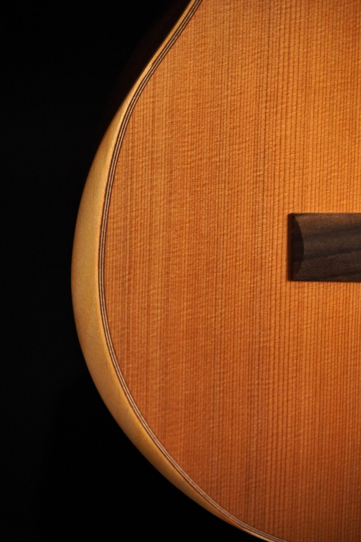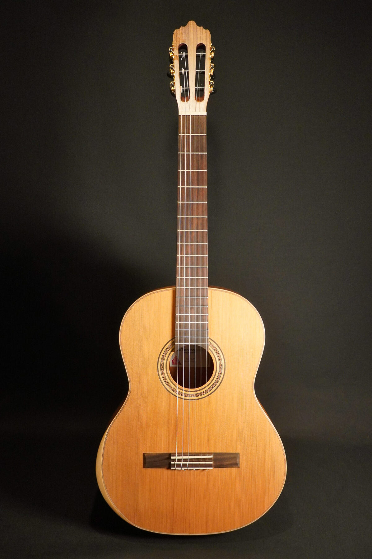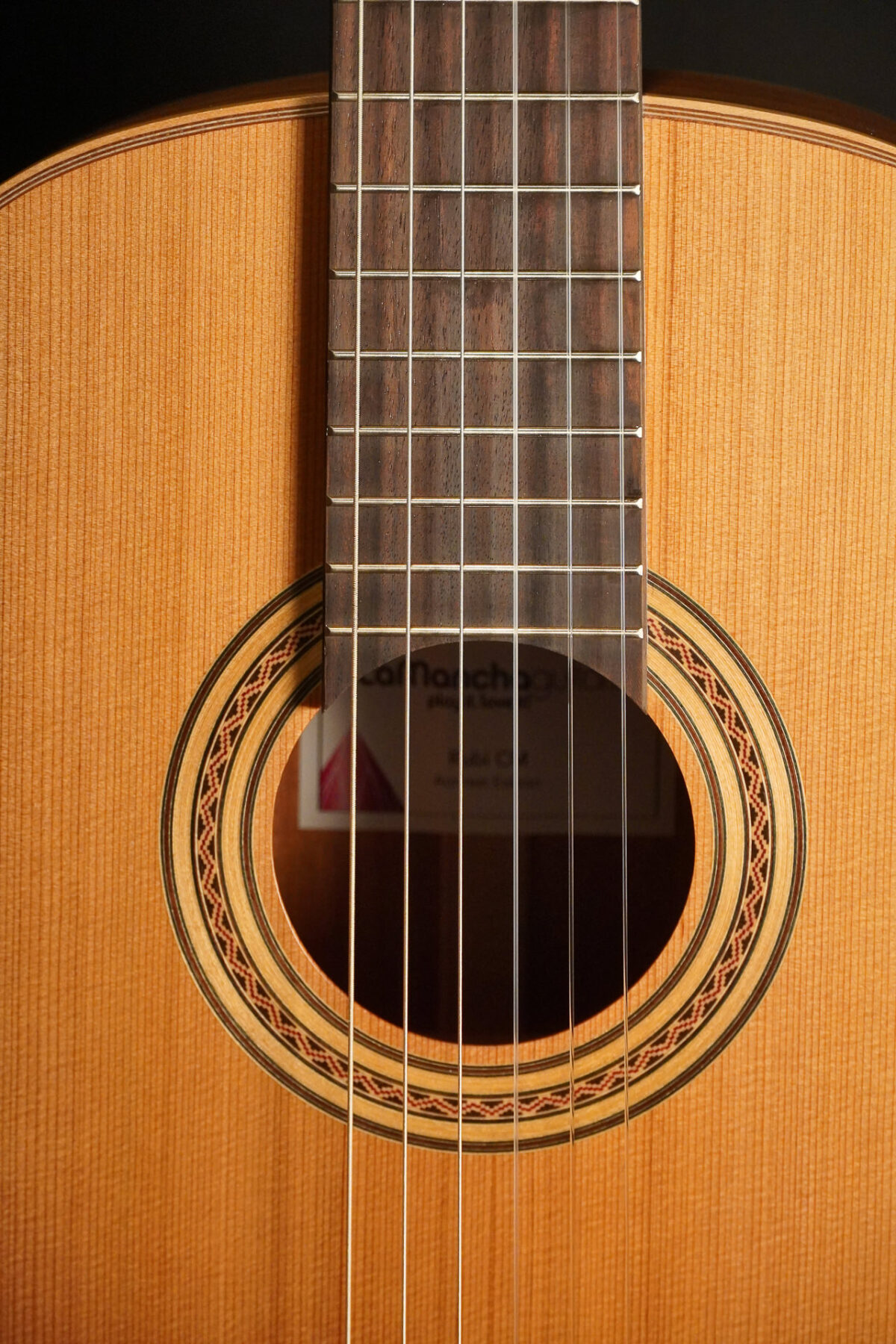 Schöne Konzertgitarre in 4/4 Grösse von La Mancha. Massive Zederndecke, Korpus aus Mahagoni. Die Armrest Edition kommt mit einer praktischen Armschräge, die das Spielen der Gitarre angenehmer macht.