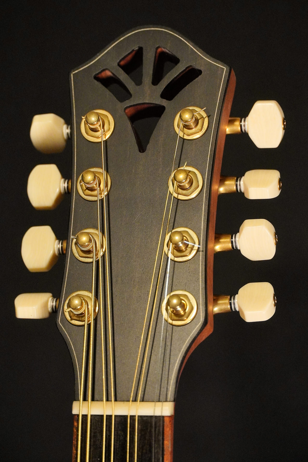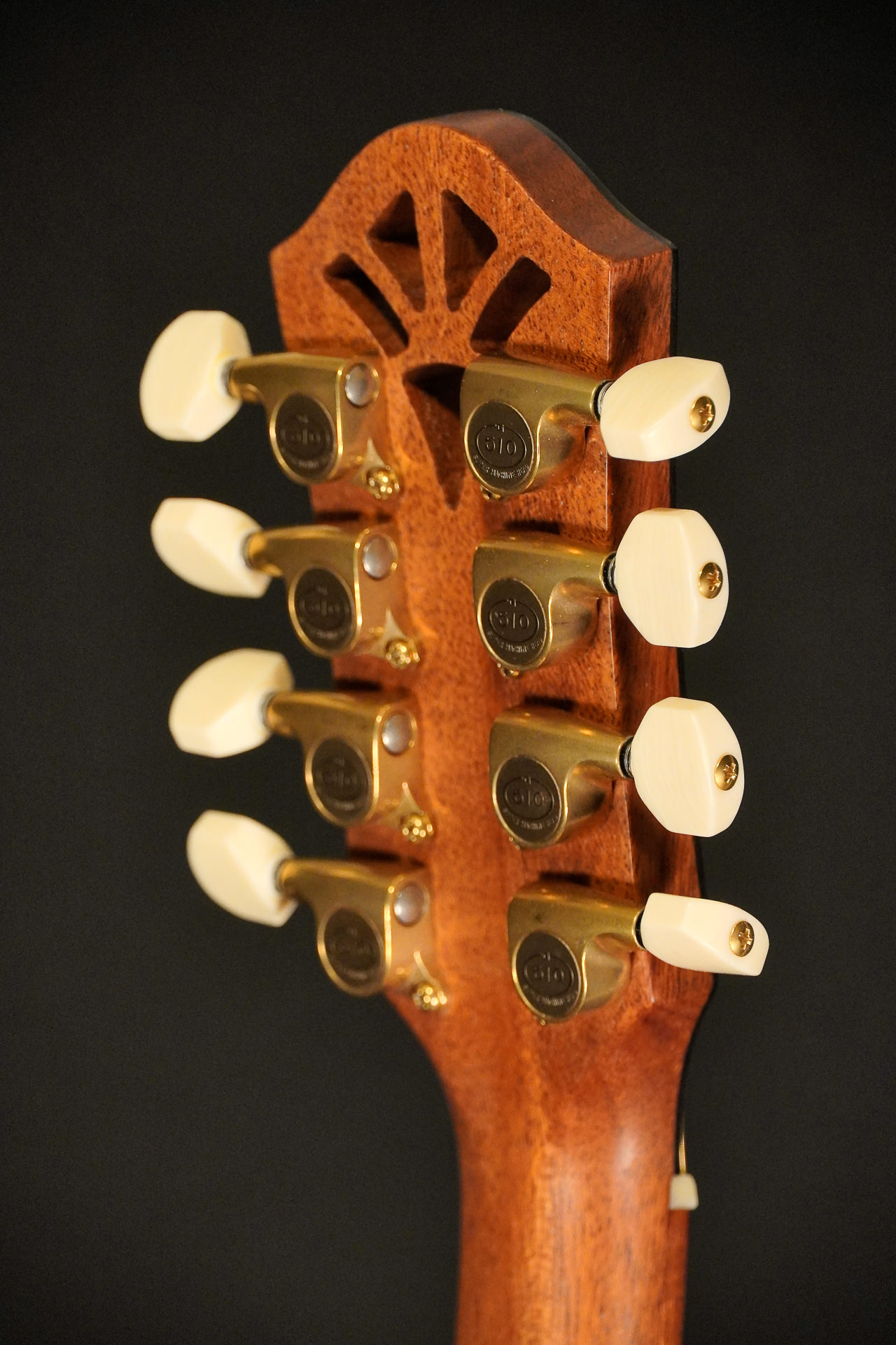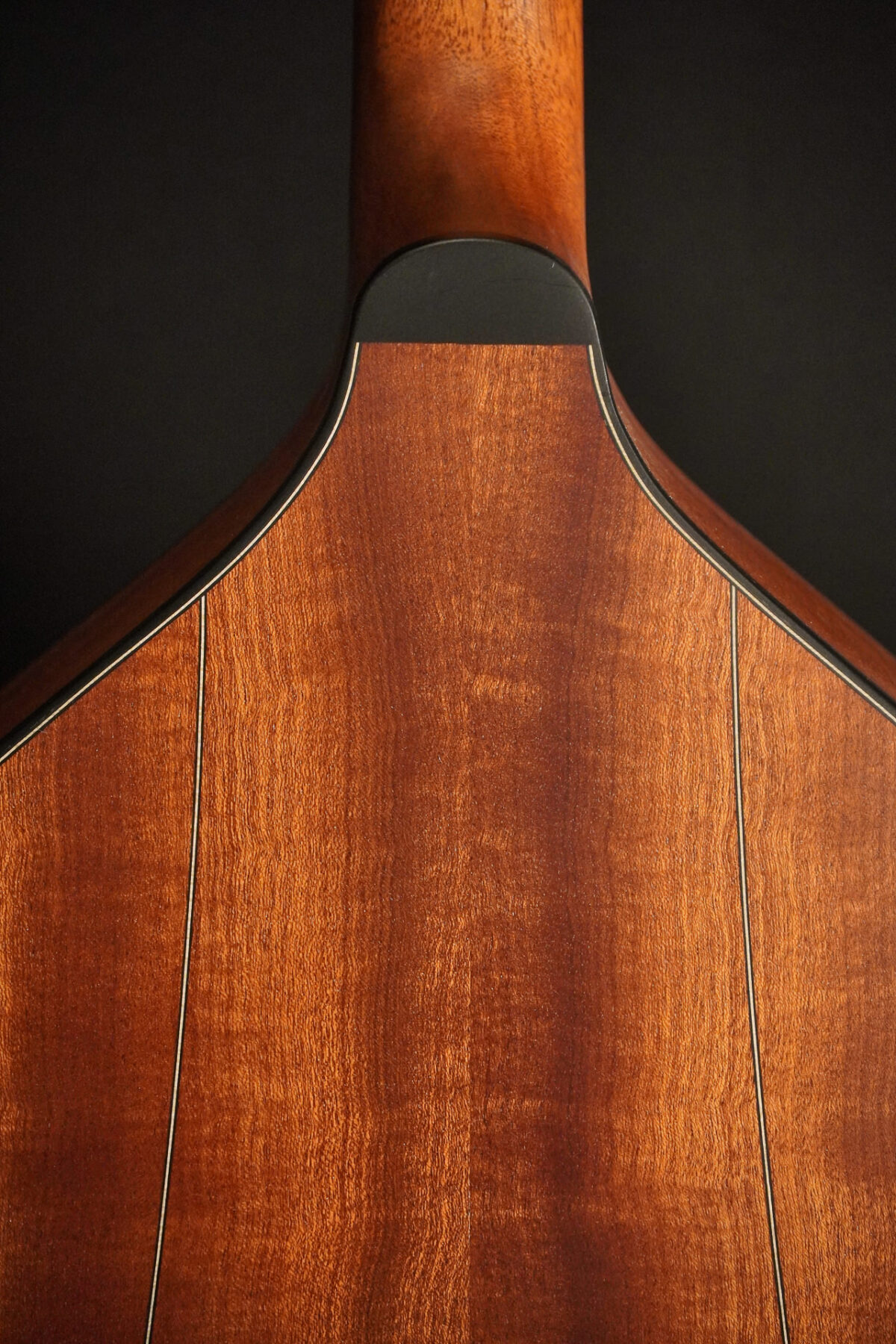 Unser Modell „medieval“ mit gefensterter Kopfplatte, Schallochinlay und mittelalterlichen Griffbretteinlagen. Decke aus massiver Thermofichte, Korpus aus massivem Mahagoni mit Einlage.