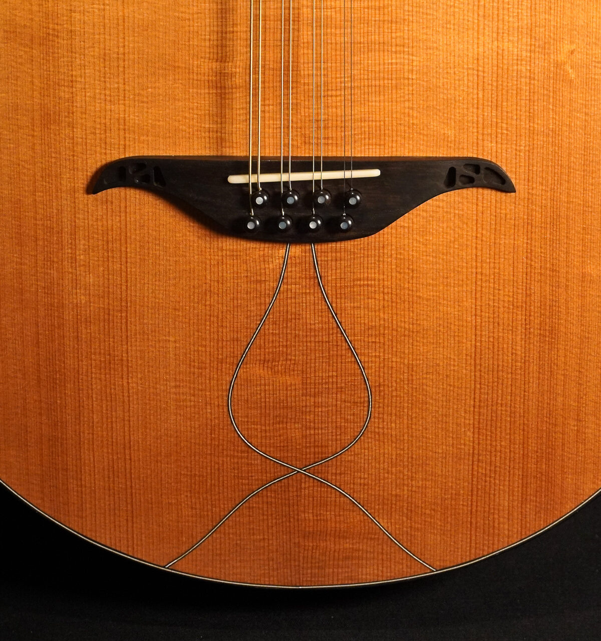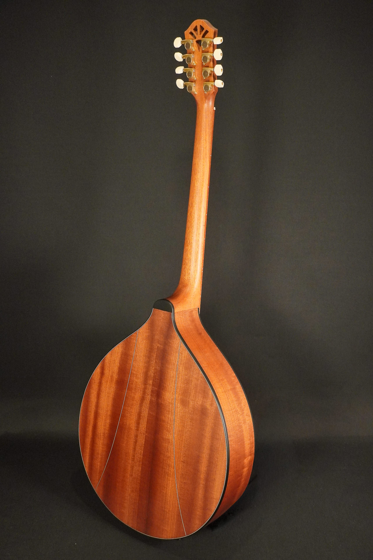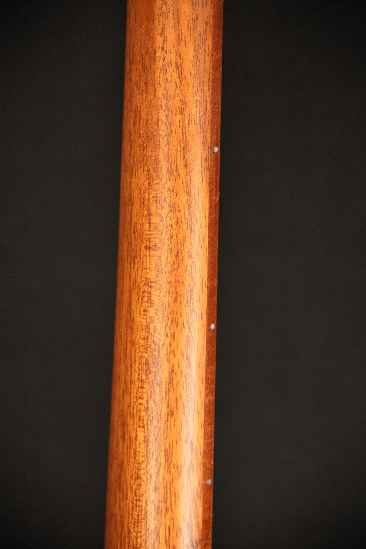 Unser Modell „medieval“ mit gefensterter Kopfplatte, Schallochinlay und mittelalterlichen Griffbretteinlagen. Decke aus massiver Thermofichte, Korpus aus massivem Mahagoni mit Einlage.