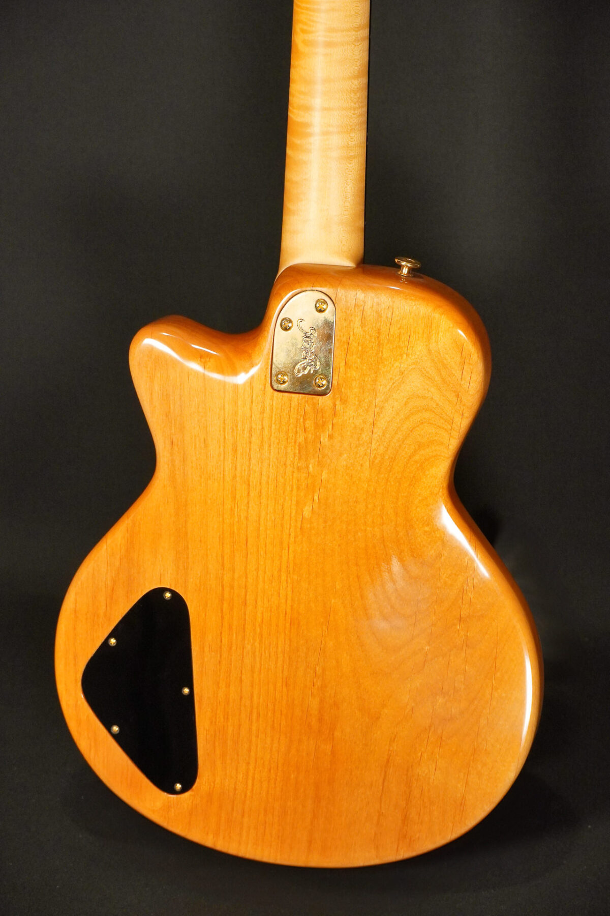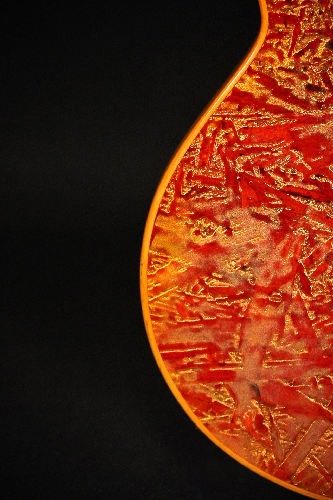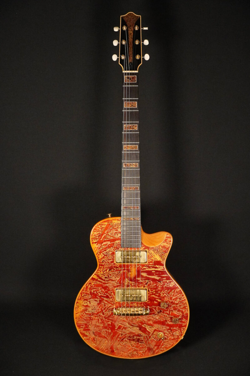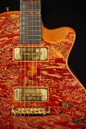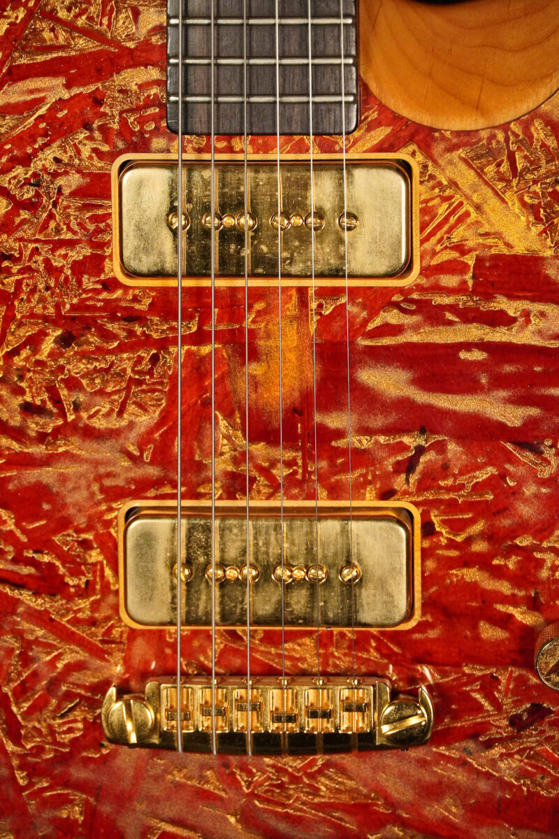 Bei unseren OSB – Decken Gitarren haben wir mit dem Material OSB Pressholz experimentiert und hier Schicht für Schicht verschiedene Farben und Lacke aufgetragen um einen dreidimensionalen Effekt zu erzeugen.Den Korpus der Gitarren fertigen wir aus massiver Erle. Eine kleine und handliche Blues-Maschine, die mit den verbauten Häussel P90 Tonabnehmern so richtig schön singt!